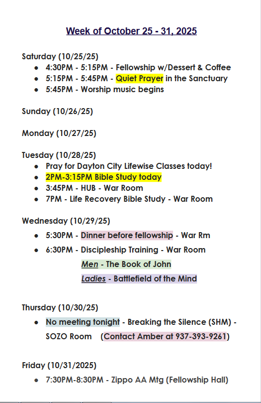 Bible Study is from 2 - 3pm. Recovery Bible Study is from 7 - 8pm