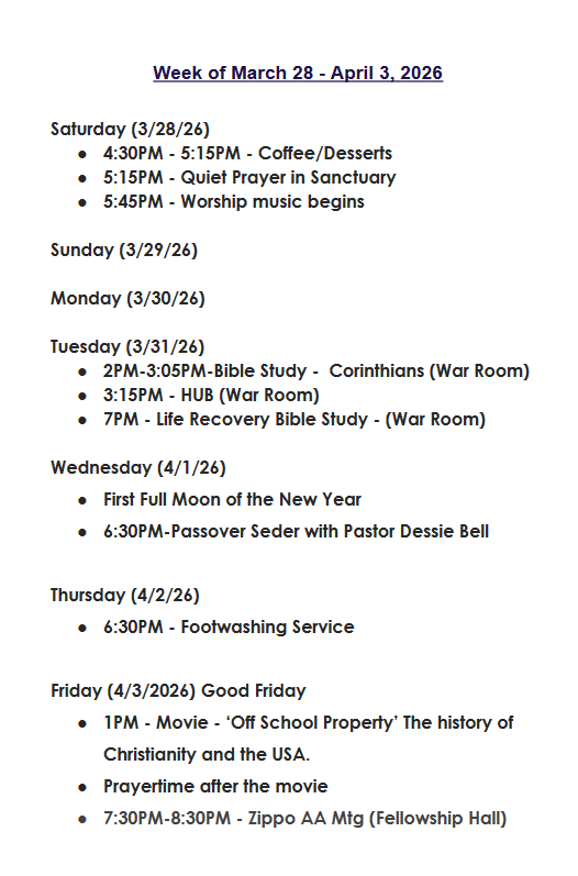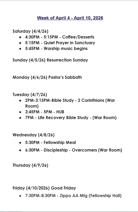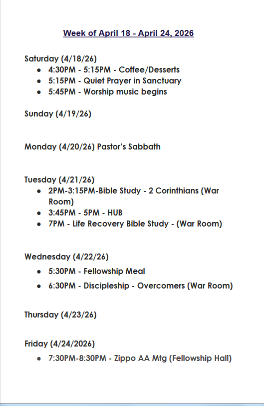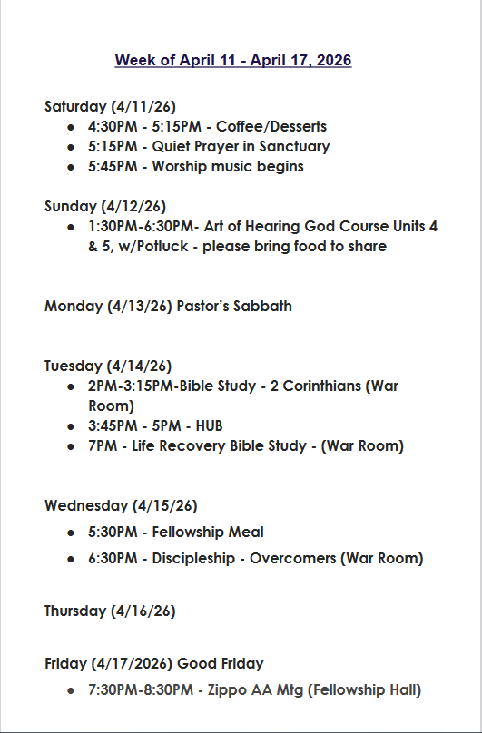Join us each Saturday night for fellowship from 4:30 - 5:30pm.