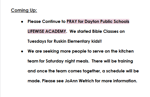 Specifically, we financially support and have volunteers working to grow the LifeWise program to the Dayton Public Schools!